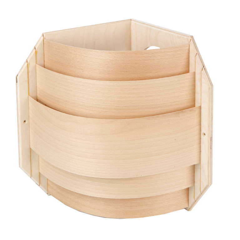 Applique d'angle constituée de bandes de bois fixées sur une base en contreplaqué.