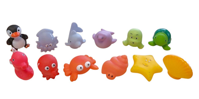 Lot de 12 jouets aspergeurs en PVC souple, facilitant l’approche aquatique des jeunes nageurs par le jeu et permettant de développer la motricité fine et l'imagination.