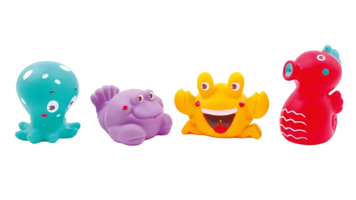 Lot de 4 jouets aspergeurs en PVC souple, facilitant l’approche aquatique des jeunes nageurs par le jeu et permettant de développer la motricité et l'imagination.