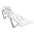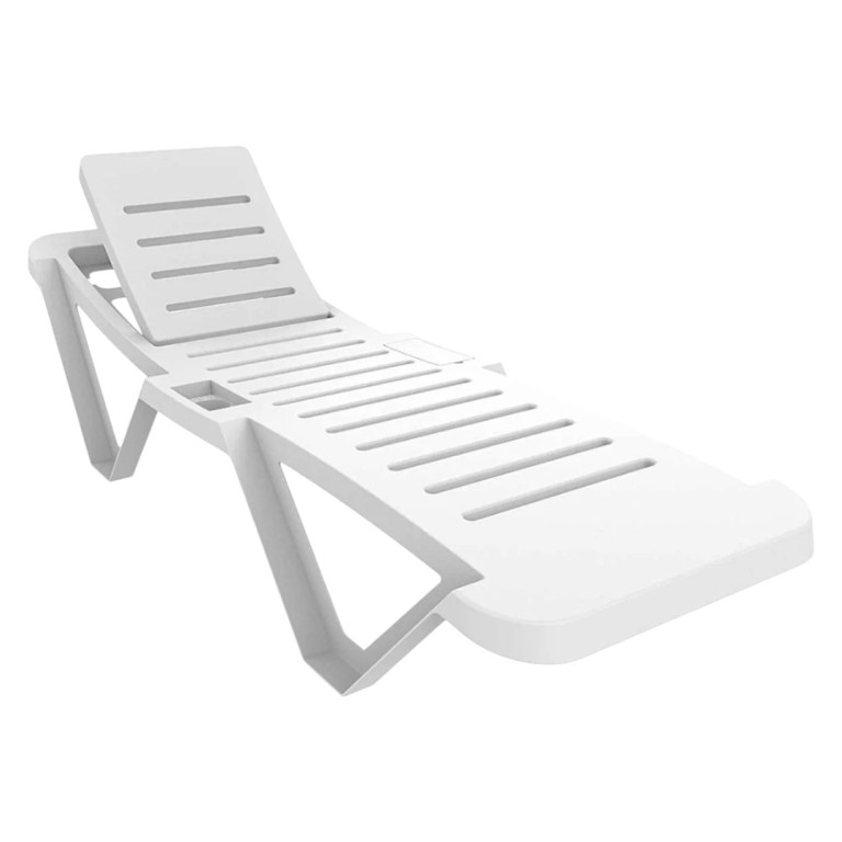 Chaise longue empilable pour intérieur et extérieur. Munie de roues arrières et d'un compartiment sur le côté droit pouvant recevoir un verre. Dossier réglable avec 5 positions. Jusqu'à 110 kg de capacité de charge.