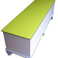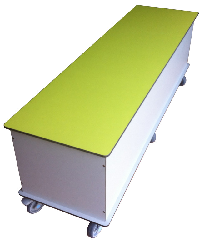 Fabriqué par La Piscine Collective, ce banc coffre est monté sur 6 roues dont 2 avec frein.