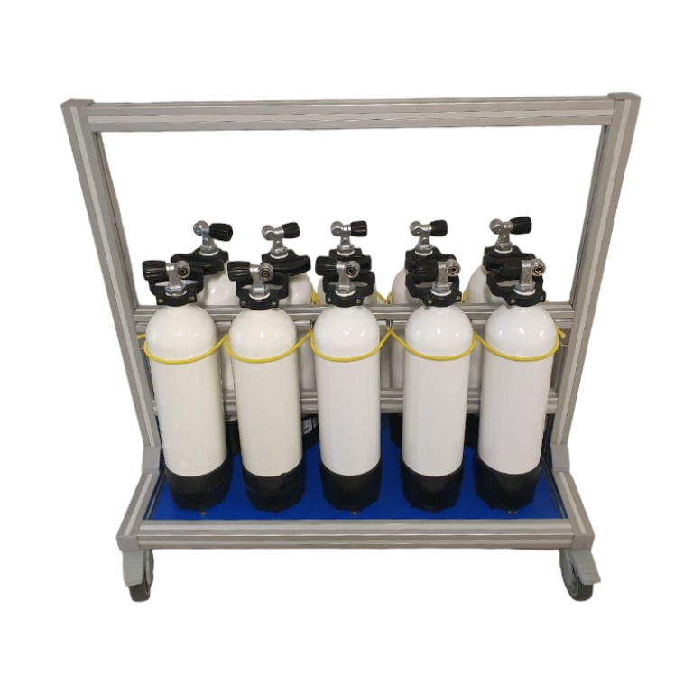Chariot permettant de transporter et stocker 10 bouteilles de plongée.