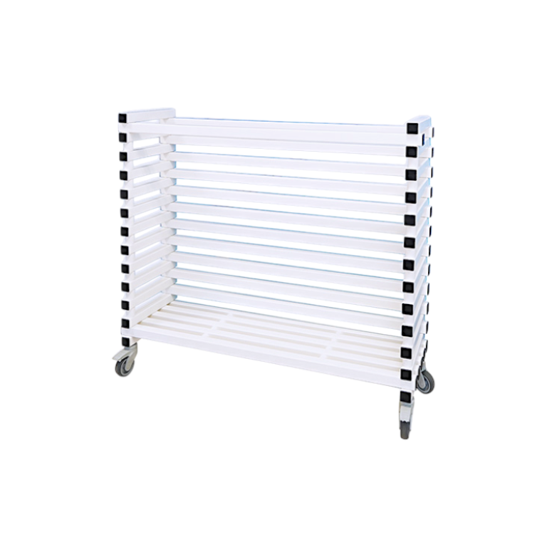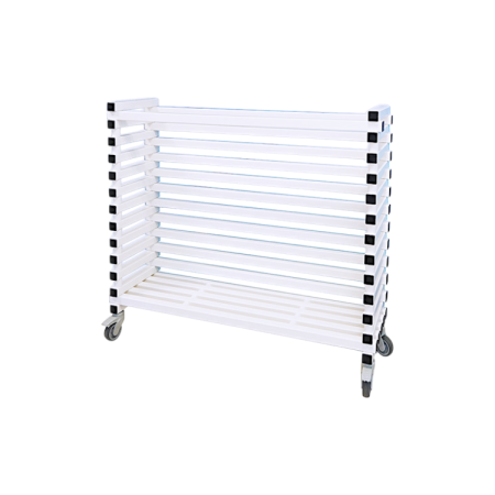 Monté sur 4 roues en polyamide avec une bande en caoutchouc anti-bruit et non marquante, dont 2 roues avec un système de frein.