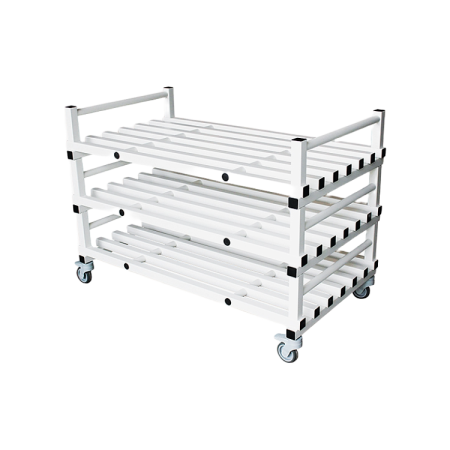 Structure tubulaire carrée constituée de 3 étagères et montée sur 4 roues pivotantes, dont 2 avec frein.