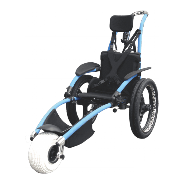 Le châssis existe en 4 tailles (S, M, L et XL) et en deux couleurs (rose et bleu). Les tubes de châssis en aluminium sont traités pour l’eau de mer. Les tubes gainés bleus ou roses confortables au toucher, ne chauffent pas au soleil et protègent du froid l’hiver. Les axes et demi-axes de roues sont en inox. Les roues jumelées sont sans roulement à billes évitant le grippage par oxydation. La jante extérieure en aluminium recouverte d’un Grip sert de main courante à l’utilisateur.