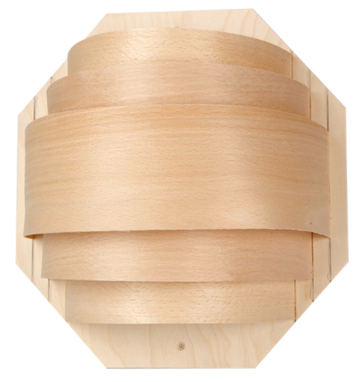 Applique constituée de bandes de bois fixées sur une base en contreplaqué.