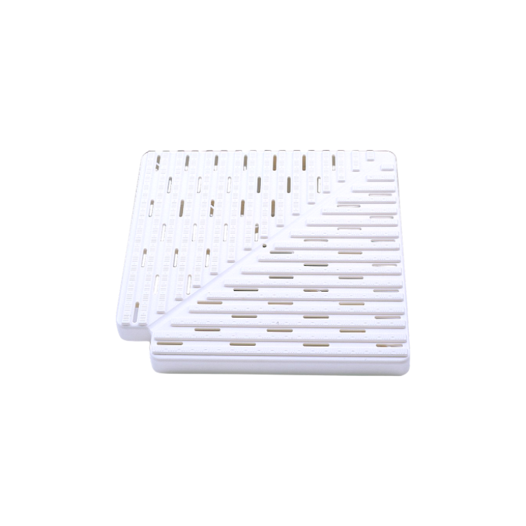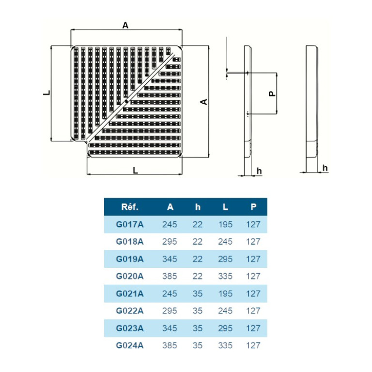 Grille de débordement d'angle 90° haute de 22 mm. Résistance aux chocs, aux UV, à la corrosion, au chlore, à l´eau de mer et aux eaux thermales. Aucun élément métallique.