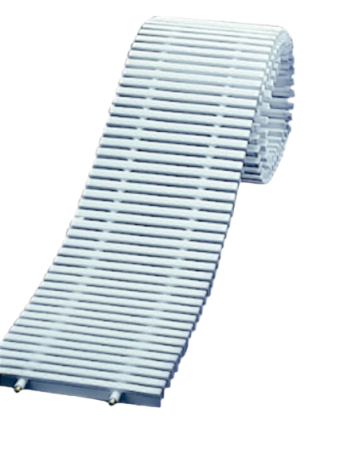 Grille de goulottes enroulable et perpendiculaire. Constituée de 49 profilés pleins au mètre linéaire hauts de 22 mm. Assemblage par câble.
