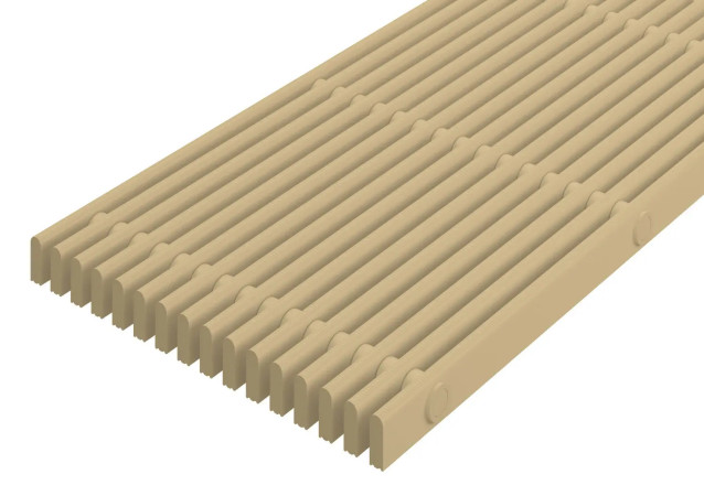 Grille de débordement rigide et parallèle en segment de 1 m. Profilés avec une surface arrondie, de 27 x 10 mm, et espacés de 8 mm.