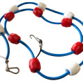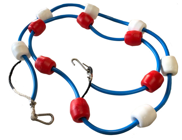 Ligne de nage enroulable, montée sur corde Ø 6 mm ou sur câble 316 Ø 4 mm avec des flotteurs Olupso Ø 65 mm et des intercalaires de 20 cm.