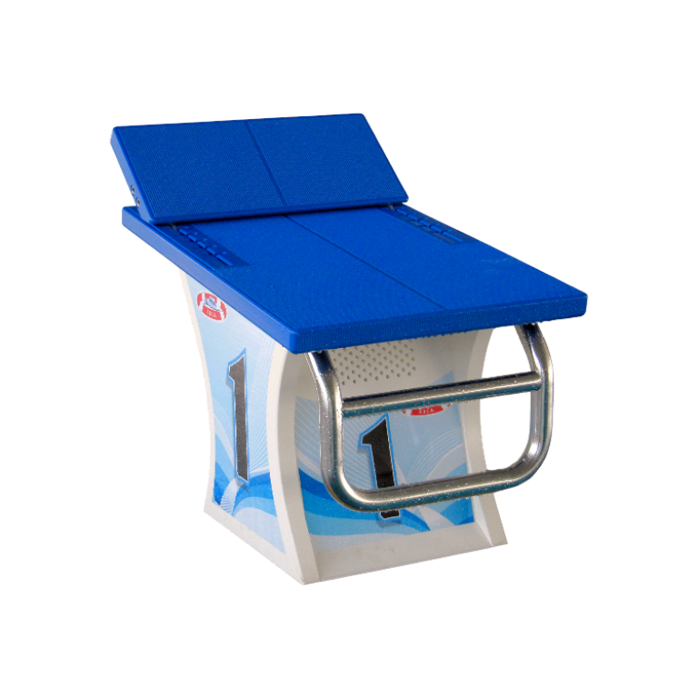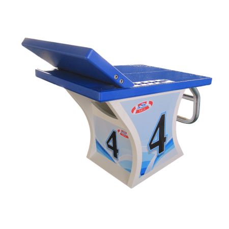 Plot de départ en PVC constitué d'une plateforme polyéthylène de 50 x 70 cm inclinable jusqu'à 10°, d'un track start réglable et d'un capteur faux départ.