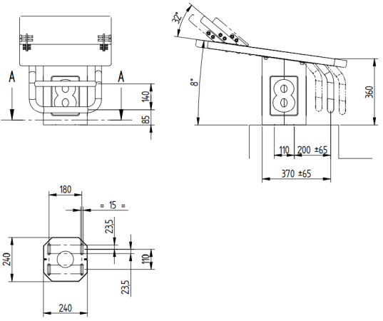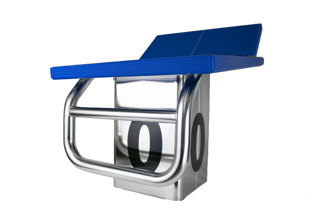 Plot de départ constitué d'une base en inox 316L et d'une plateforme polyéthylène haute densité antidérapante de 50 x 70 cm inclinée jusqu'à 10°.