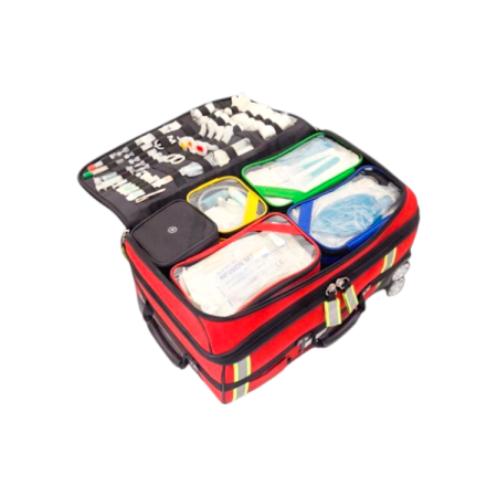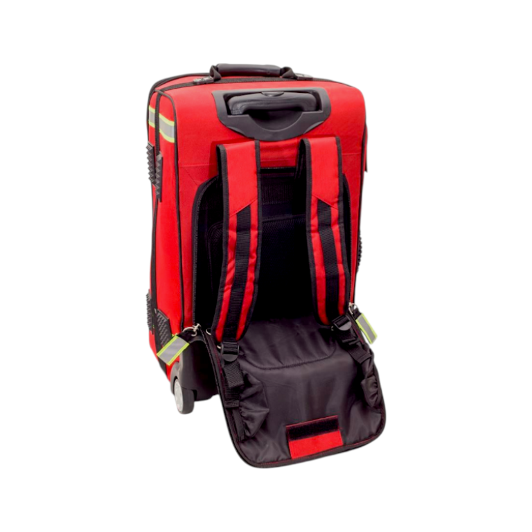 Sac à dos sur roulettes de grande capacité permettant de transporter tout le matériel nécessaire de façon ordonnée en cas d’urgence.