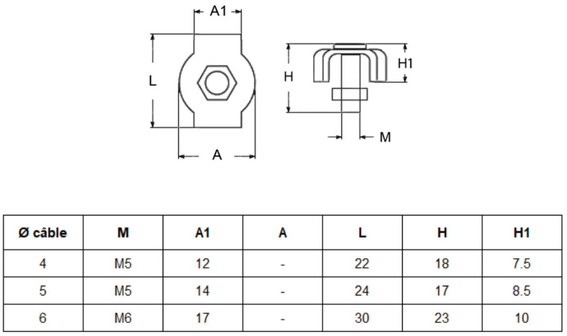 Serre-câble simple en inox 316 disponible pour différents Ø de câble.