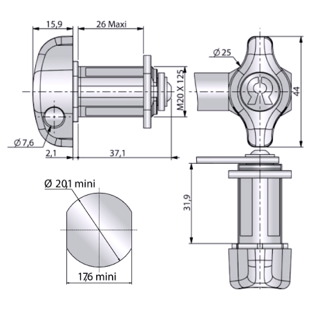 Serrure cadenassable droite compatible avec nos meubles stratifié compact La Piscine Collective. Serrage 26 mm. Came et cadenas non inclus.