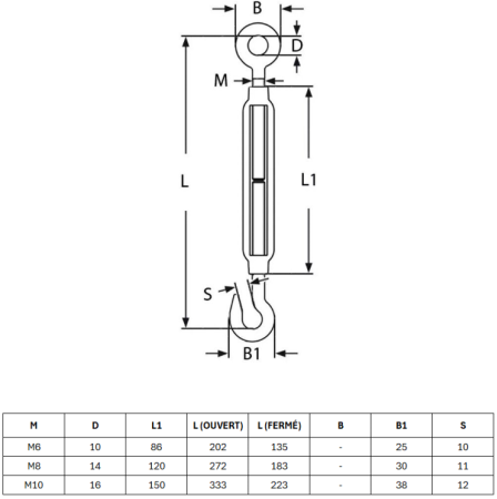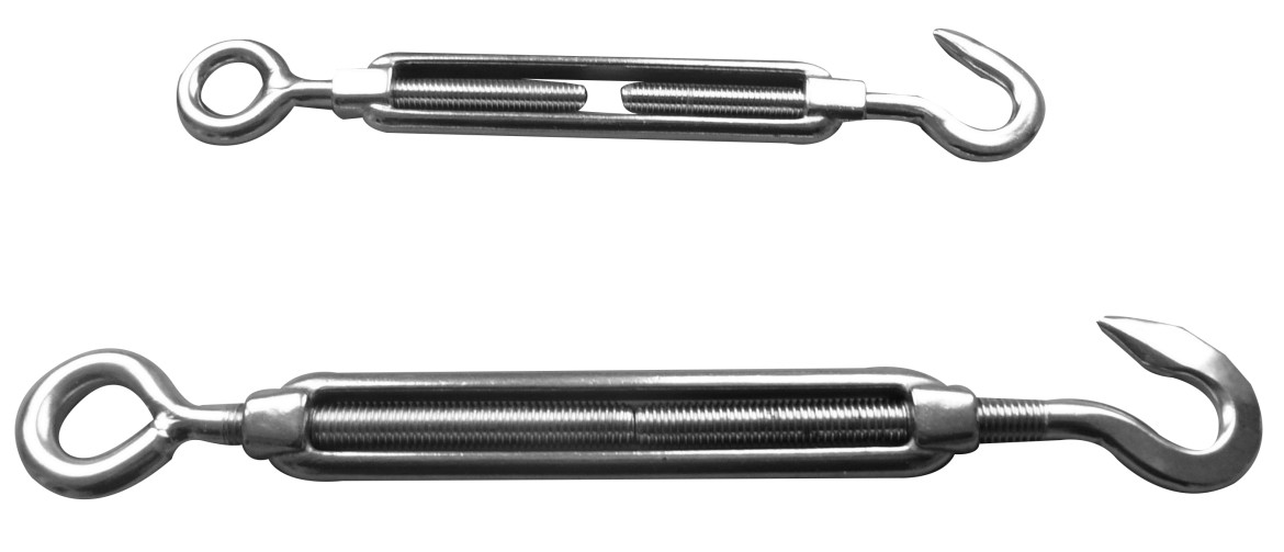 Tendeur oeil-croc pour tendre les lignes de nage. Diamètre du système de tension à multiplier par 2 pour respecter la charge de rupture (ex. : câble Ø 4 = tendeur M8).